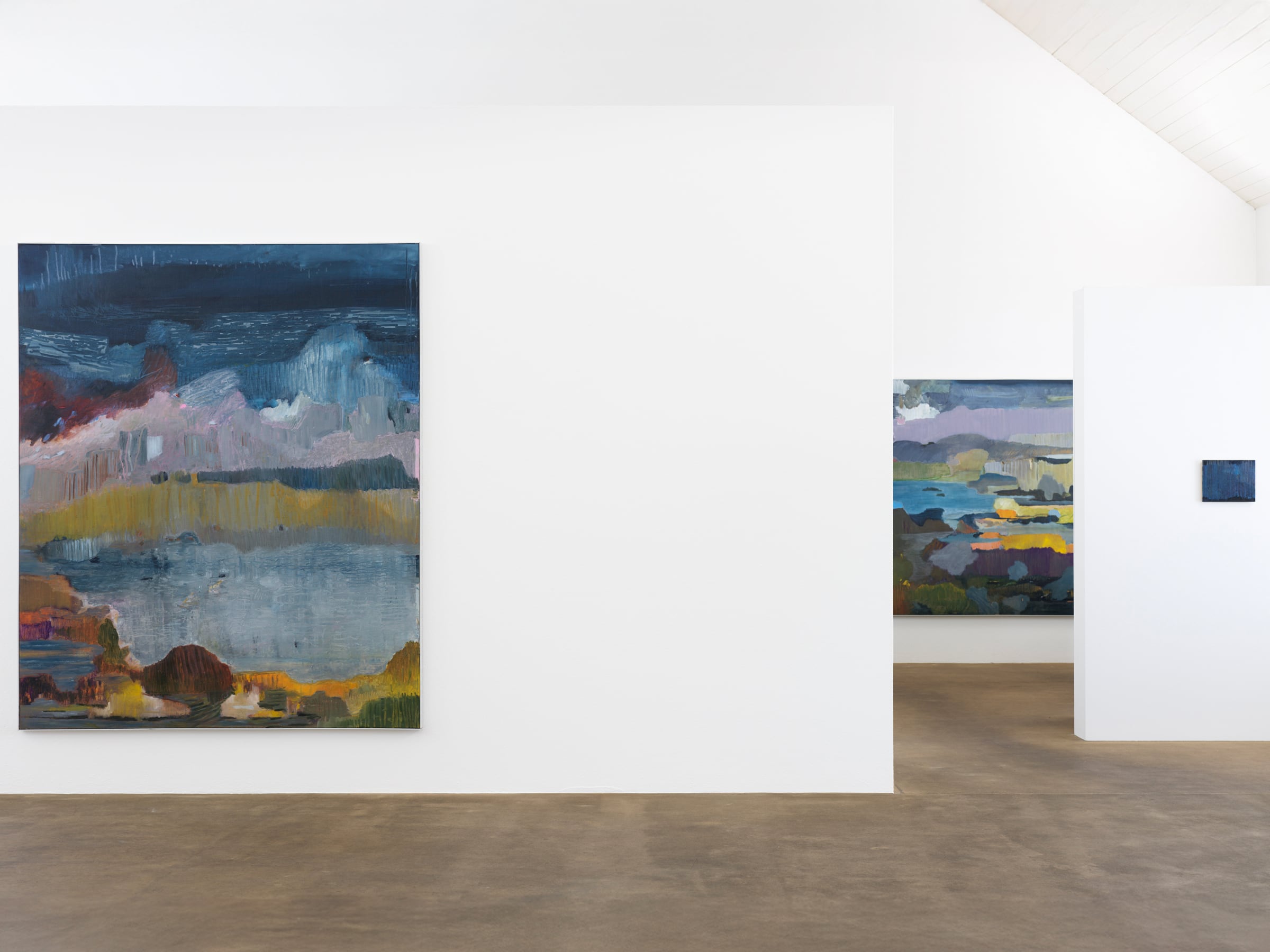 Seit 2019 arbeitet Lisa Hoever auch in Öl auf Papier, solche Arbeiten wurden 2021 erstmals ausgestellt, und hier haben wir etwa zur Hälfte Aquarelle und Öl auf Papierarbeiten. Für die Entdeckung dieser Technik, die der Malerin sehr entgegenkommt, weil die Malerei ähnlich flüssig ist und sich überhaupt ähnlich verhält wie die Wasserfarbe, spielte wieder der Zufall eine Rolle: sie erhielt einen Riesenstapel Restpapier von der Druckerei, Papier das beim Druck der Nomaden, übrig geblieben ist. Ich kann hier nur ganz kurz eingehen: Sie arbeitet mit stark terpentinverdünnter Ölfarbe auf einem Papier, das wenig Farbe aufsaugt, das sie aber sehr leicht fliessen lässt. Sie arbeitet mit dem Pinsel, aber dann wird Farbe auf das Blatt gegossen, das Blatt bewegt, der Fluss etwas gesteuert, aber es wird der Eigenbewegung der Farbe sehr viel Freiheit zugestanden. Die Farbe verläuft sich, schreibt der Dichter, gewiegt auf der Blattschaukel. Es gilt ebenfalls, was die Malerin zum Aquarell gesagt hat: «Es bedeutet, dass ich genau weiss, es passiert etwas, wenn ich mit einer Farbe komme, und die andere ist noch nass. Es kann zerfliessen, kaputt gehen, aber es kann auch genau richtig sein. Die Gefahr der Zerstörung muss da sein.. «.